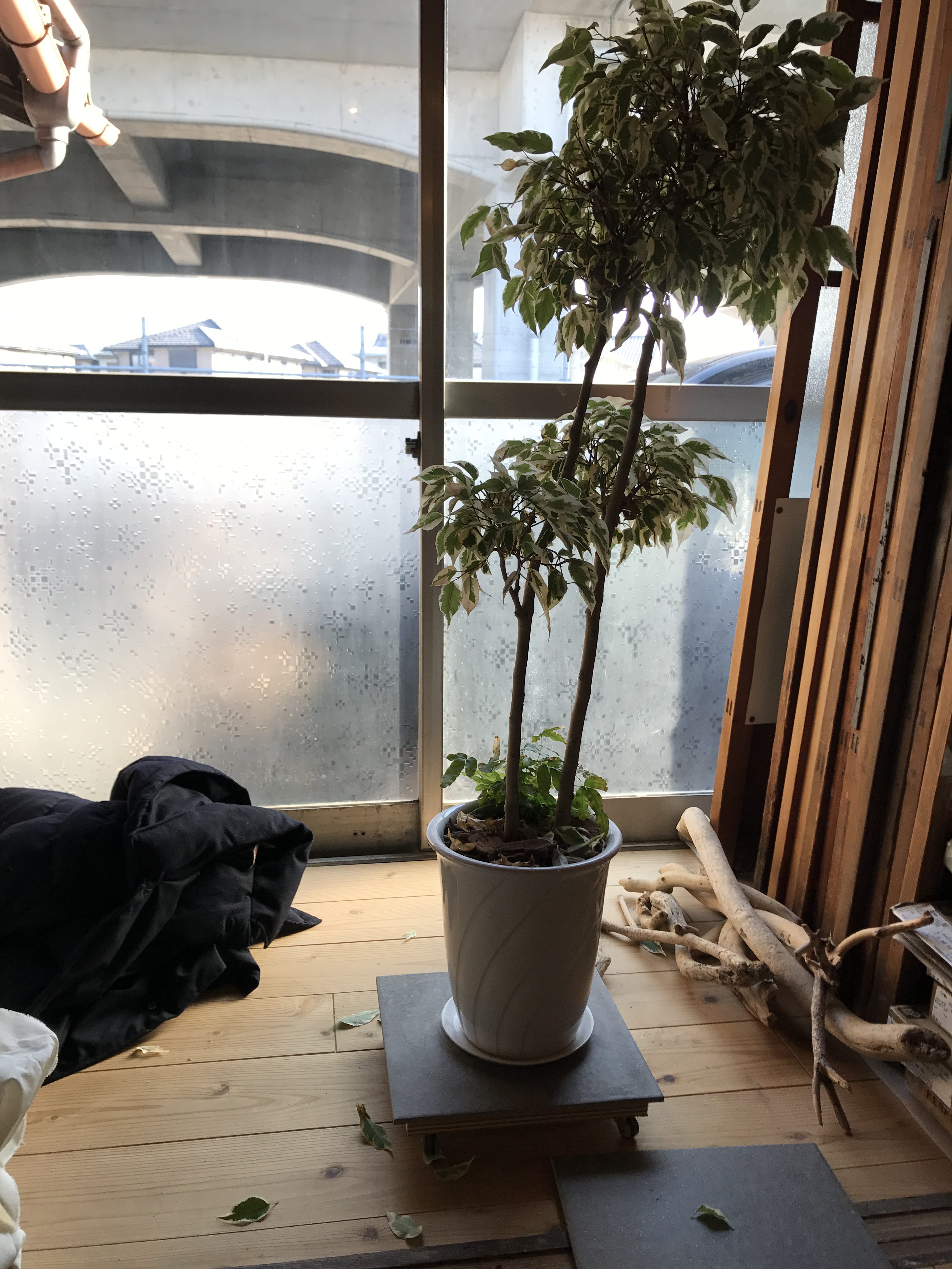 植栽を日の当たる場所へ動かしやすいように台を作っています。