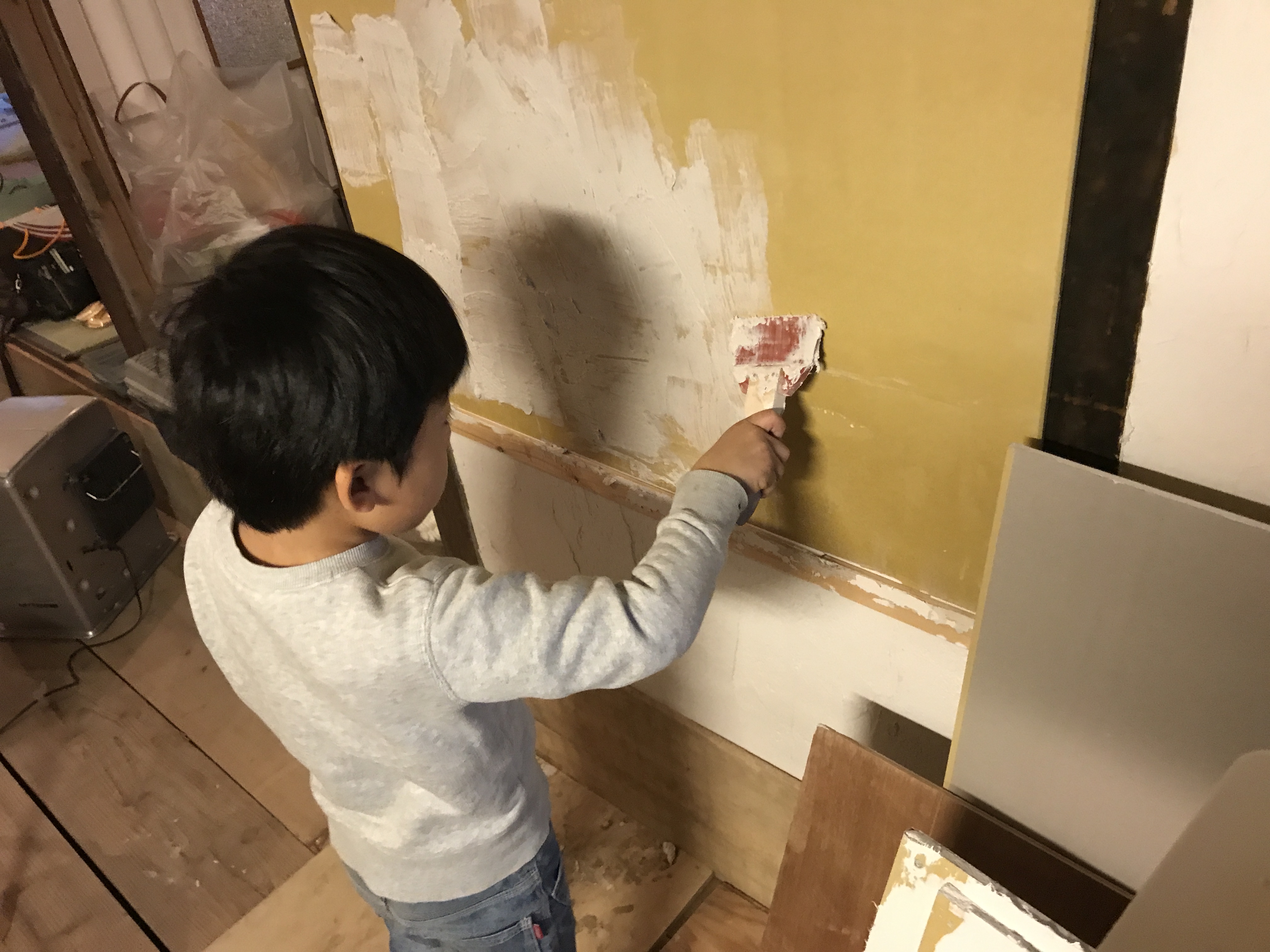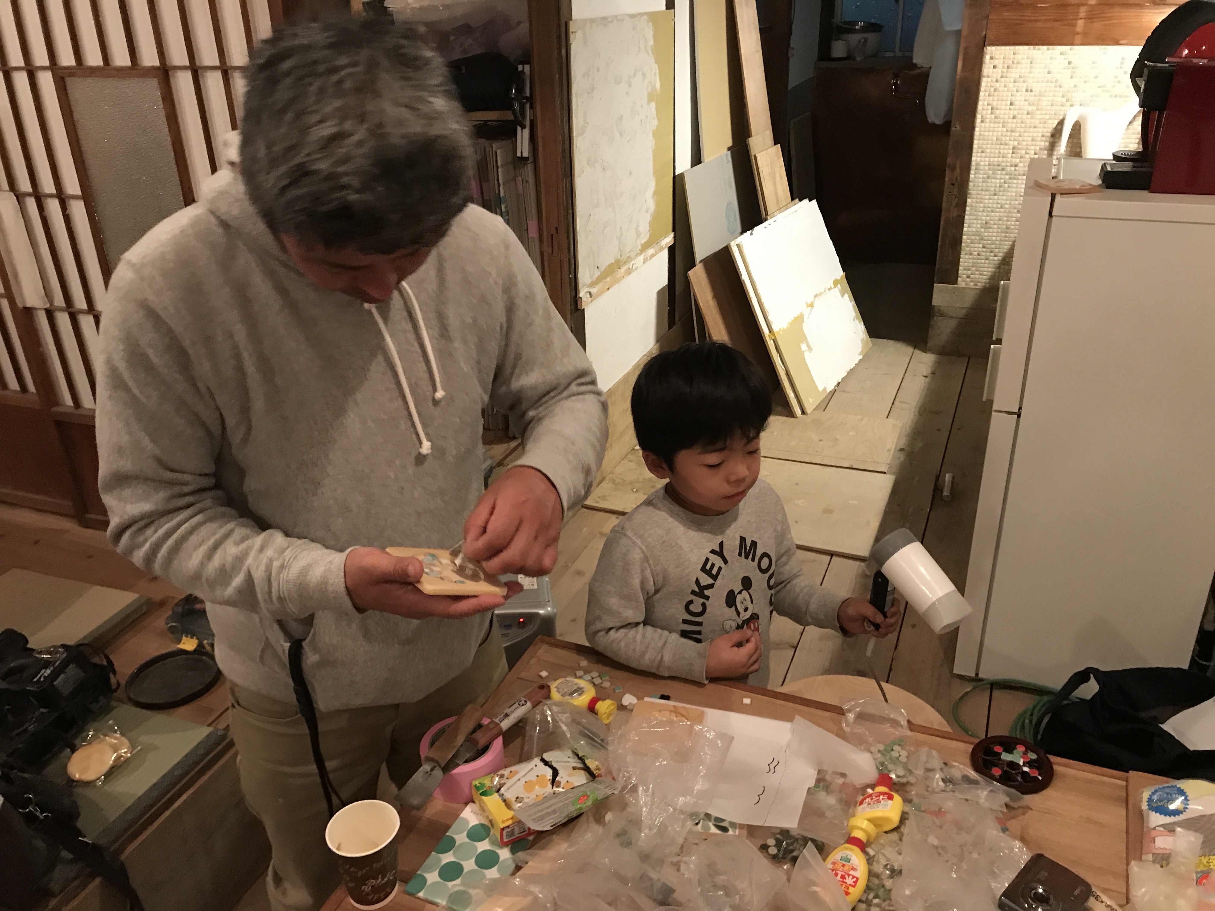 やったことないことをと、タイルを合板に貼るのとキャスターをその裏に取り付ける作業をしてもらいました。